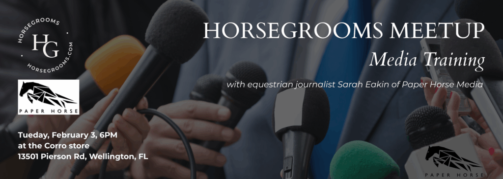 On Tuesday, February 3, HorseGrooms will host a MeetUp focused on Media Training for Grooms, led by experienced equestrian journalist Sarah Eakin of Paper Horse Media.